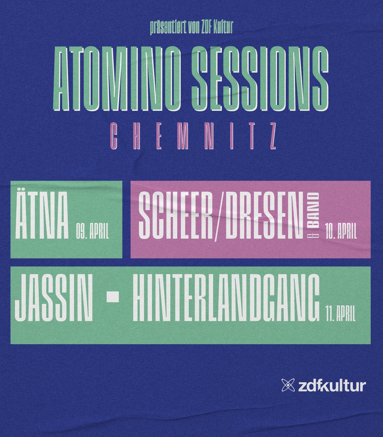 Das Konzert-Doku-Format erzählt vier ganz unterschiedliche Geschichten und stellt so neue und bekannte Acts auf eine besondere Art vor. Dazu gibt es eine großartige Aufzeichnungen der Clubshows im Atomino. Die Sessions versammeln vier Acts, die jeweils ihre persönliche Geschichten einbringen. Mit dabei sind die Hinterlandgang aus Demmin, ein HipHop-Duo mit direktem, humorvollem Zugang zu ihrer Herkunft und ihr Leben als linker HipHop Act in Ostdeutschland, Jassin - vielleicht bald ein neuer Star - aus der Lutherstadt Wittenberg, dessen Songs durch Nähe und stimmliche Präsenz überzeugen; Ätna aus Dresden, deren avantgardistischer Elektro-Pop seit Jahren begeistern, sowie der Schauspieler Alexander Scheer (Ost-Berlin) und Regisseur Andreas Dresen (aus Gera), die Songs von Gundermann interpretieren und dessen Werk neu ausloten. Alle vier Konzerte entstanden im Musikclub Atomino, parallel zum Kulturhauptstadtjahr in Chemnitz. Die Sessions erzählen besondere (ostdeutsche) Geschichten und bieten dazu großartige Livemusik. Die Reihe ist in der ZDF Mediathek verfügbar, dort jedoch nur über gezielte Suche auffindbar. Regie und Buch: Martin Groß. Die Auswahl der Künstler*innen übernahm Michael Wallies gemeinsam mit Jule Broda und Holger Faber aus der ZDF Kultur Redaktion.