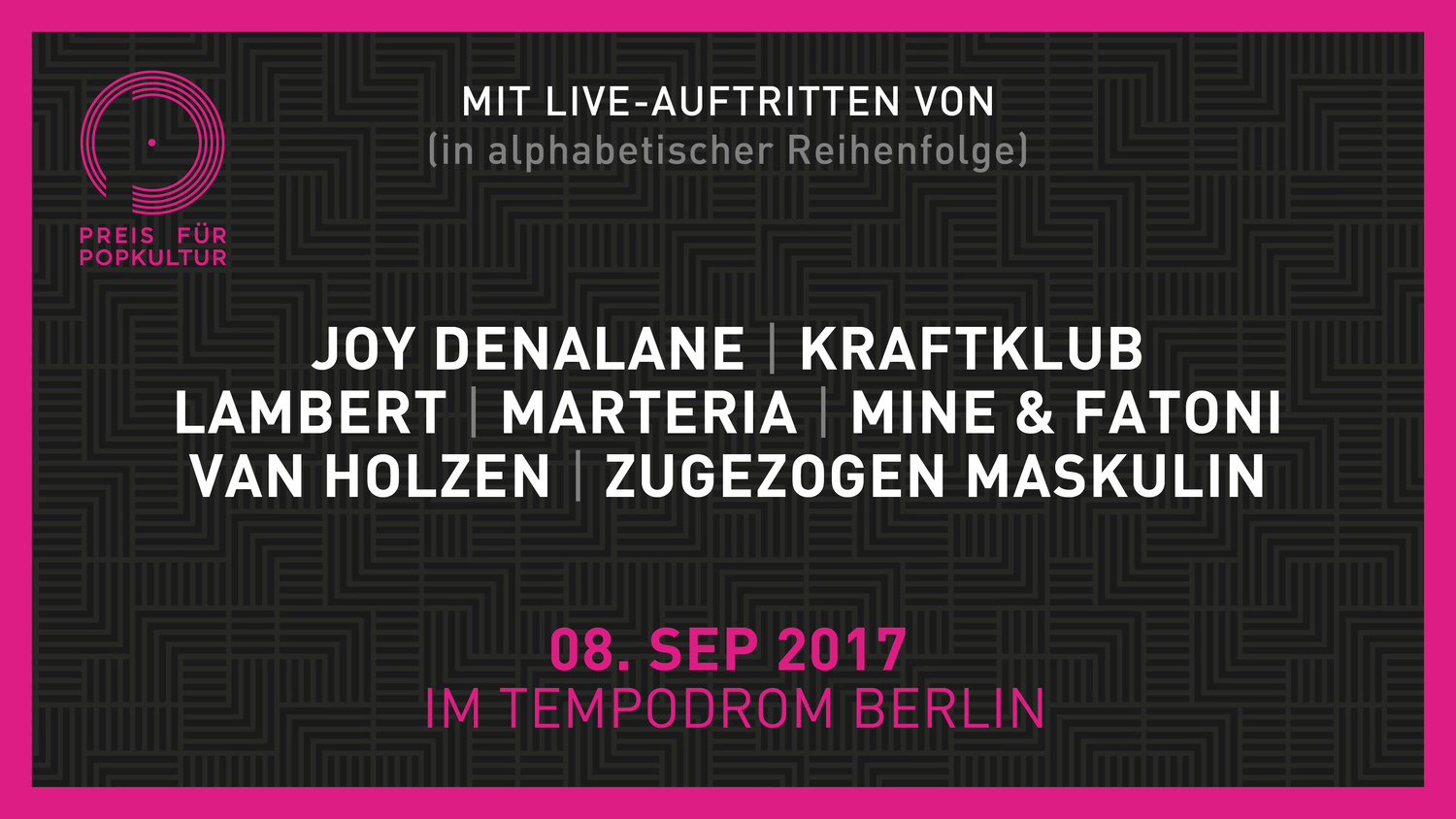 Das Live-Programm zur Verleihung des Preis für Popkultur 2017 am 8. September im Berliner Tempodrom ist final. Zugezogen Maskulin komplettieren als siebter Show-Act die Gala.